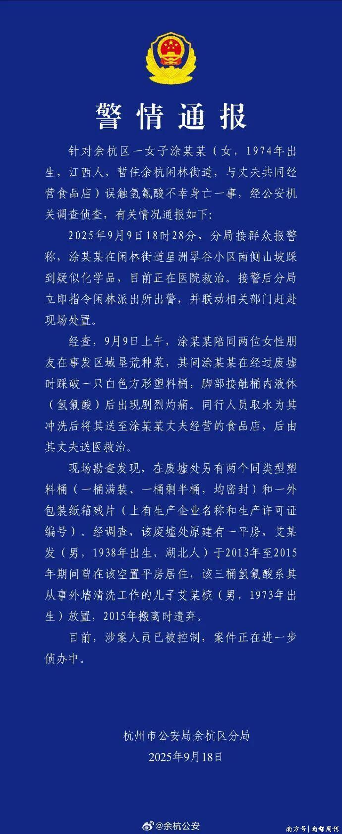 针对余杭区一女子涂某某(女,1974年出生,江西人,暂住余杭闲林街道,与丈夫共同经营食品店)误触氢氟酸不幸身亡一事,经公安机关调查侦查,有关情况通报如下: